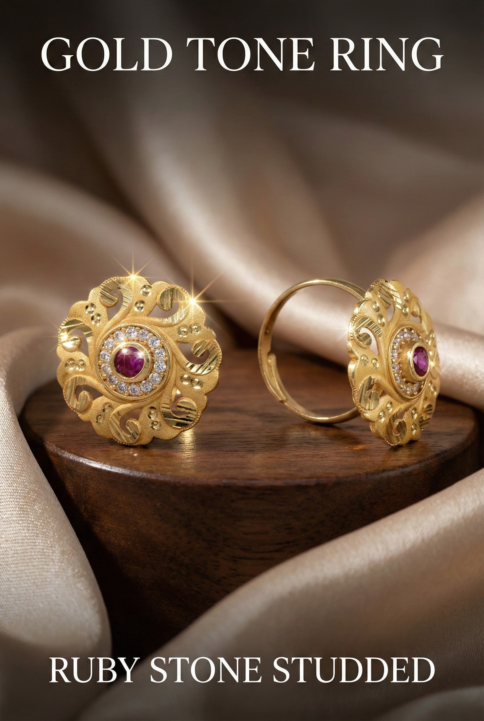 Make a bold and elegant statement with this Royal Floral Ruby AD Studded Ring from Rajkamal Jewellers. Designed with intricate floral craftsmanship, this premium gold plated adjustable ring features a striking ruby-colored center stone surrounded by sparkling American Diamonds (AD). The detailed petal design and textured gold finish give it a luxurious and traditional appeal, perfect for weddings, festive celebrations, and grand occasions. The adjustable band ensures a comfortable fit, making it a versatile addition to your jewelry collection or a thoughtful gifting option. ? Why You’ll Love It: Premium gold plated finish Elegant floral design Ruby center stone with AD halo setting Adjustable size for perfect fit Ideal for bridal, festive & party wear Statement piece with traditional charm Pair it with sarees, lehengas, or ethnic gowns to complete your royal look. ?? Product Details Type: Adjustable Statement Ring Stone: Ruby-colored center stone Accent Stones: American Diamonds (AD) Finish: Gold Plated Size: Adjustable (Free Size) Occasion: Wedding, Festive, Party Wear Brand: Rajkamal Jewellers