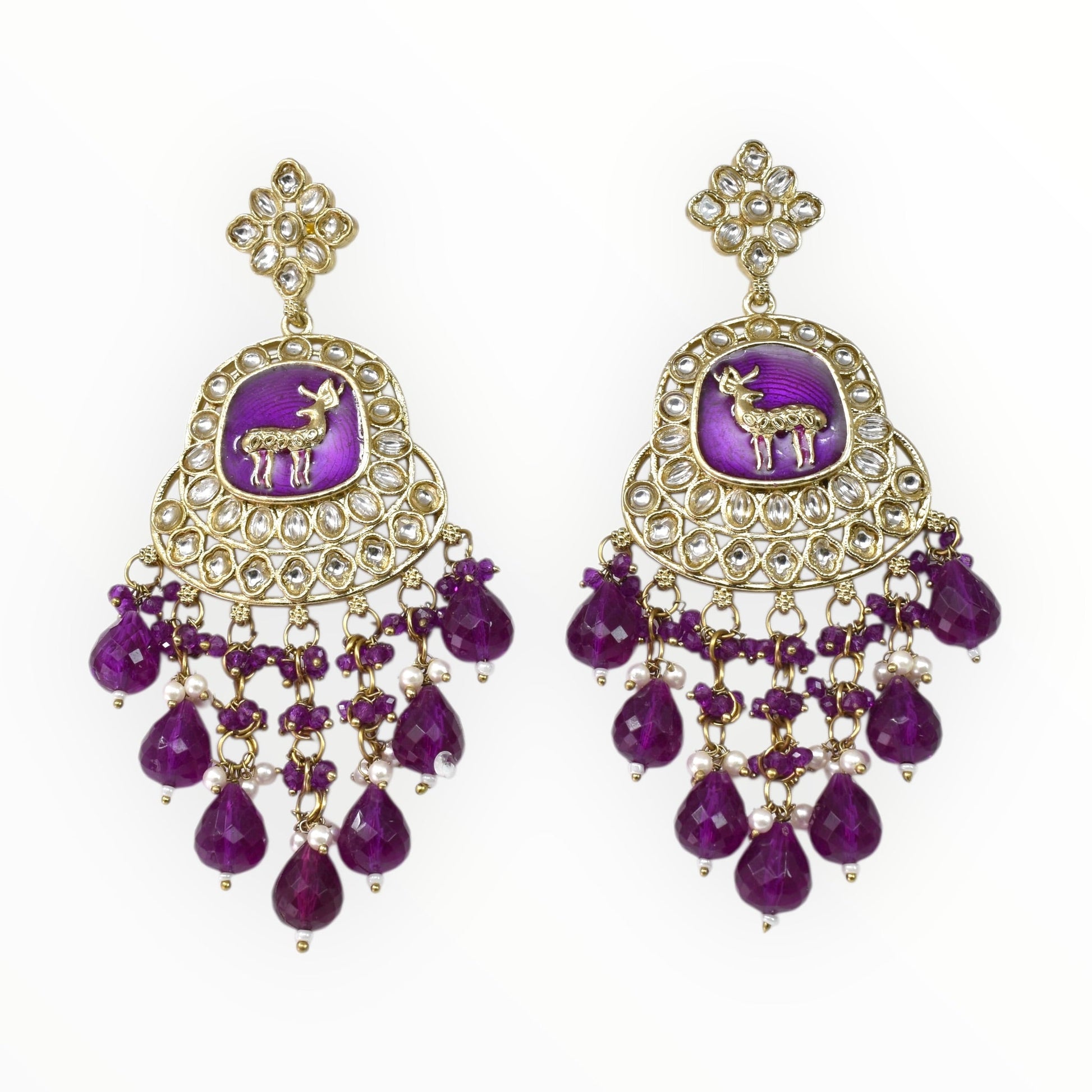 Elevate your ethnic jewellery collection with these stunning gold-plated statement earrings designed to capture attention effortlessly. Featuring intricate stone embellishments and detailed craftsmanship, this pair beautifully blends traditional elegance with modern charm.The structured upper detailing flows into an ornate lower frame adorned with carefully arranged stones and multiple layered bead danglings that create graceful movement and sparkle. The refined finishing and balanced silhouette make these earrings a perfect accessory for grand occasions.Whether styled with a classic saree, designer lehenga, or contemporary fusion outfit, these earrings add instant glamour and sophistication. A must-have festive essential for women who love bold yet elegant traditional jewellery.