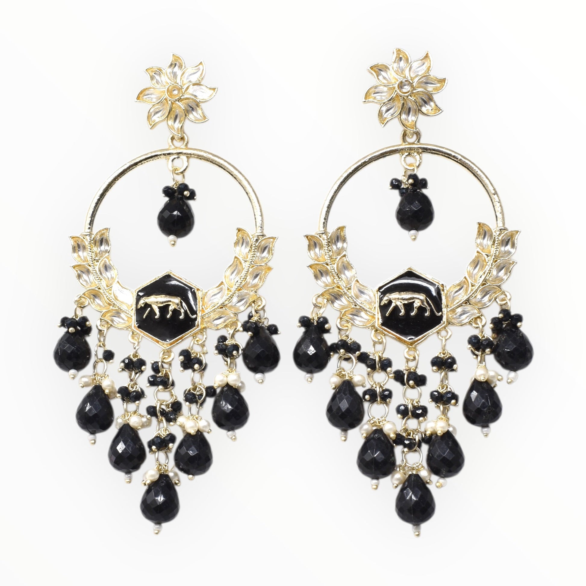 Elevate your ethnic jewellery collection with these stunning gold-plated statement earrings designed to capture attention effortlessly. Featuring intricate stone embellishments and detailed craftsmanship, this pair beautifully blends traditional elegance with modern charm.The structured upper detailing flows into an ornate lower frame adorned with carefully arranged stones and multiple layered bead danglings that create graceful movement and sparkle. The refined finishing and balanced silhouette make these earrings a perfect accessory for grand occasions.Whether styled with a classic saree, designer lehenga, or contemporary fusion outfit, these earrings add instant glamour and sophistication. A must-have festive essential for women who love bold yet elegant traditional jewellery.