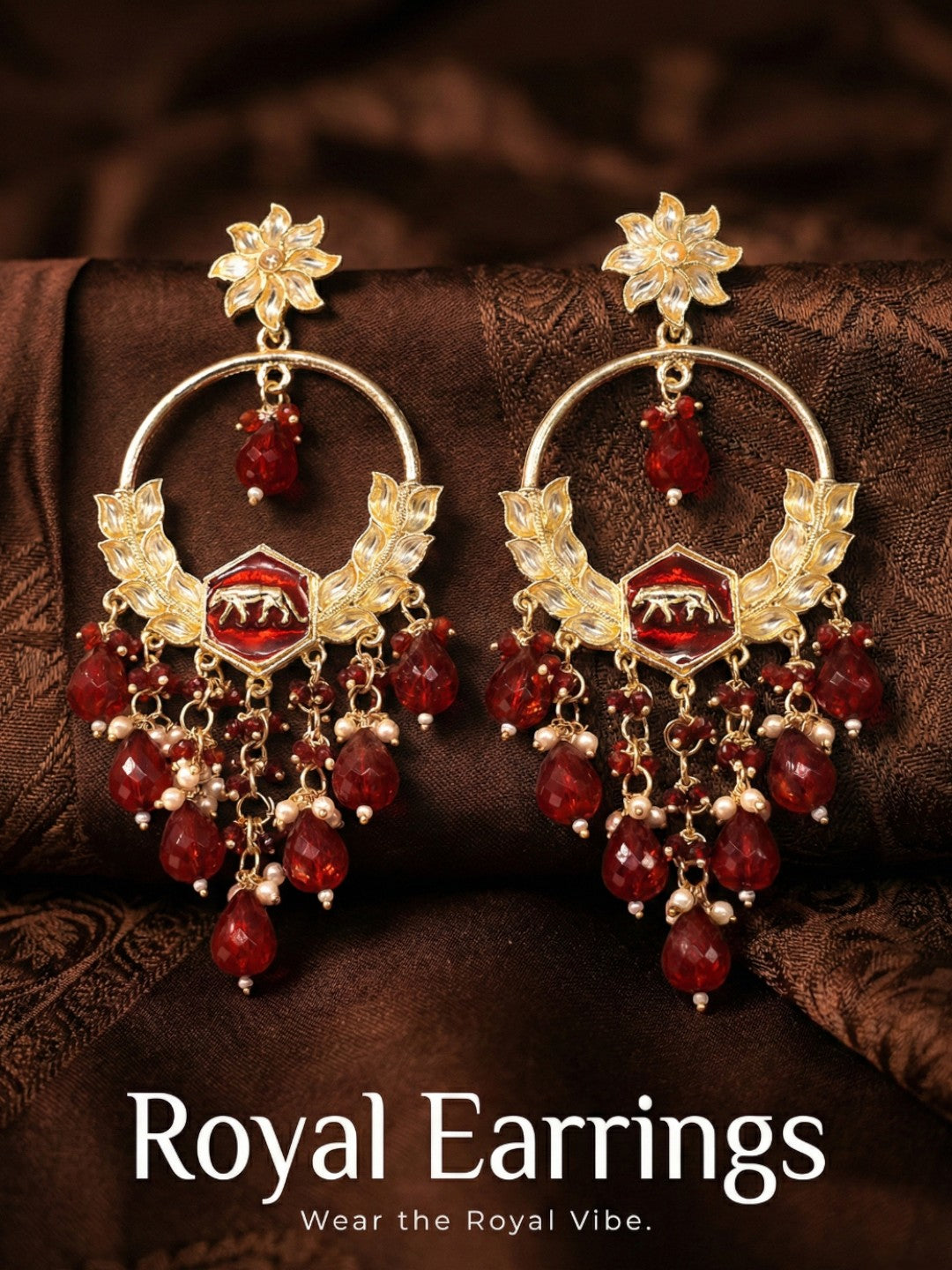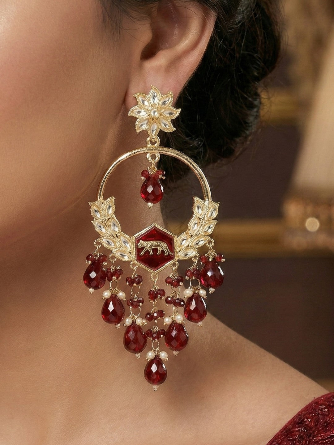 Elevate your ethnic jewellery collection with these stunning gold-plated statement earrings designed to capture attention effortlessly. Featuring intricate stone embellishments and detailed craftsmanship, this pair beautifully blends traditional elegance with modern charm.The structured upper detailing flows into an ornate lower frame adorned with carefully arranged stones and multiple layered bead danglings that create graceful movement and sparkle. The refined finishing and balanced silhouette make these earrings a perfect accessory for grand occasions.Whether styled with a classic saree, designer lehenga, or contemporary fusion outfit, these earrings add instant glamour and sophistication. A must-have festive essential for women who love bold yet elegant traditional jewellery.