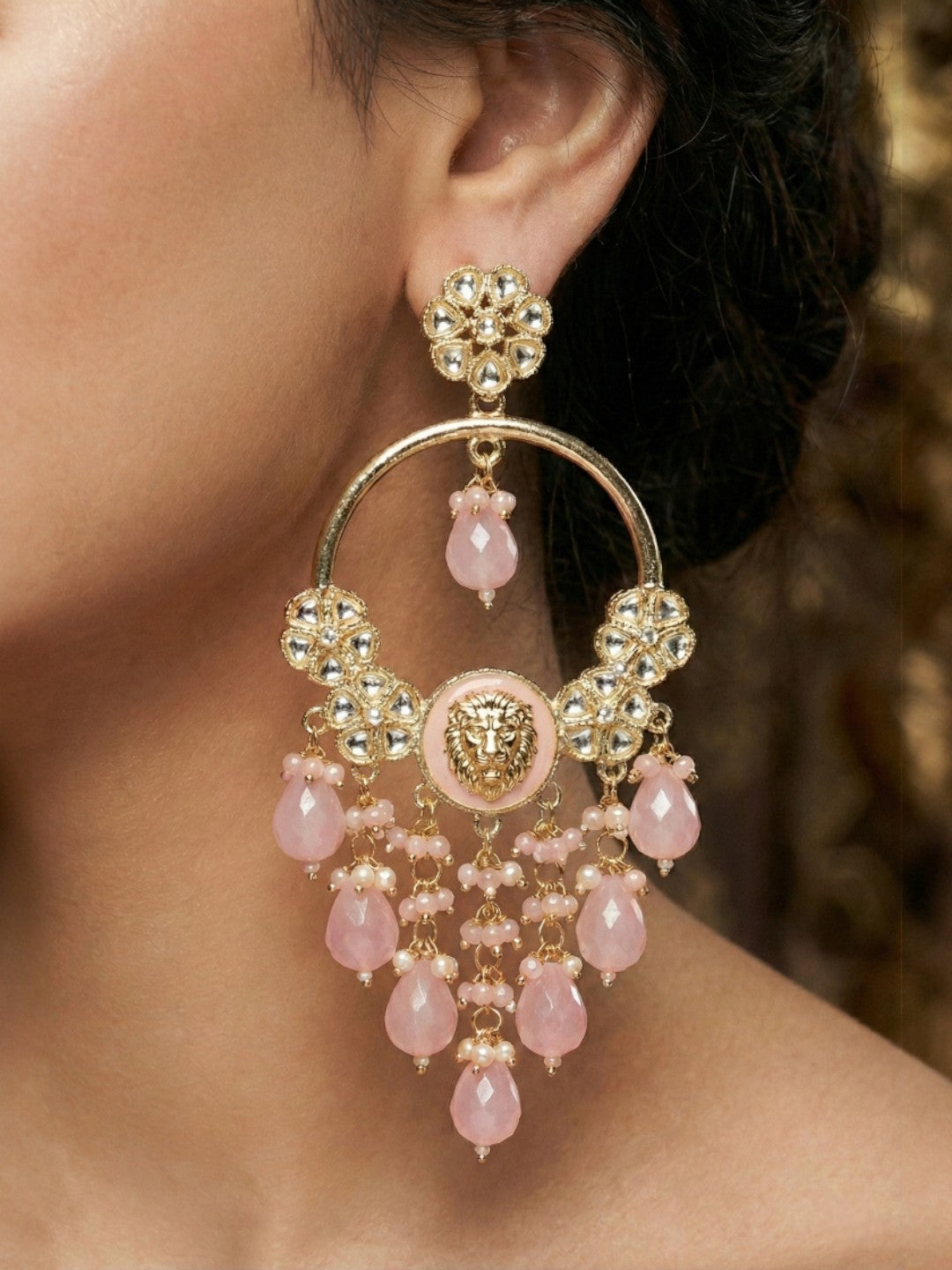 Elevate your ethnic jewellery collection with these stunning gold-plated statement earrings designed to capture attention effortlessly. Featuring intricate stone embellishments and detailed craftsmanship, this pair beautifully blends traditional elegance with modern charm.The structured upper detailing flows into an ornate lower frame adorned with carefully arranged stones and multiple layered bead danglings that create graceful movement and sparkle. The refined finishing and balanced silhouette make these earrings a perfect accessory for grand occasions.Whether styled with a classic saree, designer lehenga, or contemporary fusion outfit, these earrings add instant glamour and sophistication. A must-have festive essential for women who love bold yet elegant traditional jewellery.