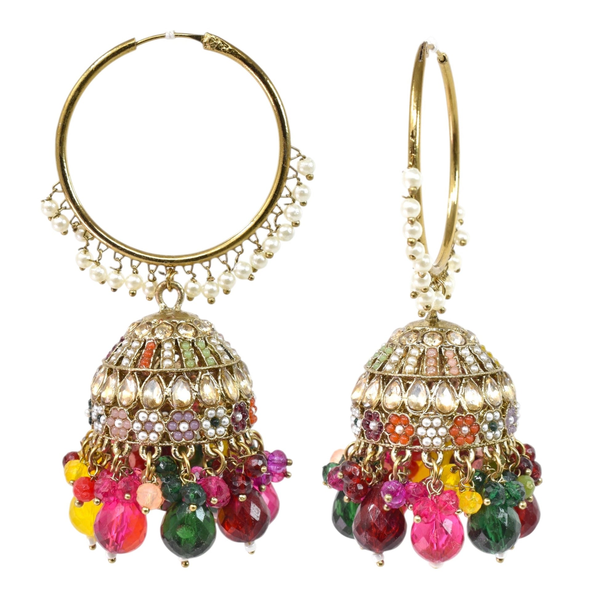 Meira Jewellery Gold Plated Multicolor Beaded Bali Jhumka Hoop Earrings for Women, Traditional Kundan Jhumki with Colorful Drops, Ethnic Festive Wedding Party Statement Earrings, Indian Jewellery-02