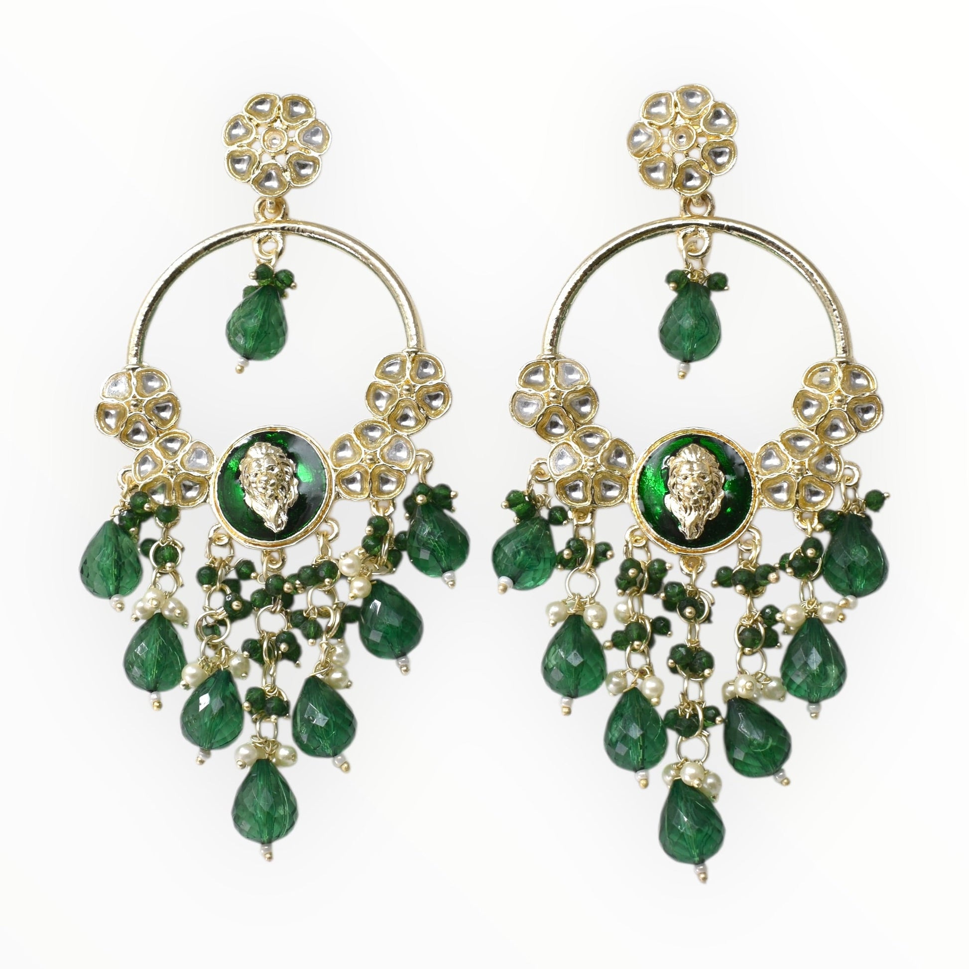 Elevate your ethnic jewellery collection with these stunning gold-plated statement earrings designed to capture attention effortlessly. Featuring intricate stone embellishments and detailed craftsmanship, this pair beautifully blends traditional elegance with modern charm.The structured upper detailing flows into an ornate lower frame adorned with carefully arranged stones and multiple layered bead danglings that create graceful movement and sparkle. The refined finishing and balanced silhouette make these earrings a perfect accessory for grand occasions.Whether styled with a classic saree, designer lehenga, or contemporary fusion outfit, these earrings add instant glamour and sophistication. A must-have festive essential for women who love bold yet elegant traditional jewellery.