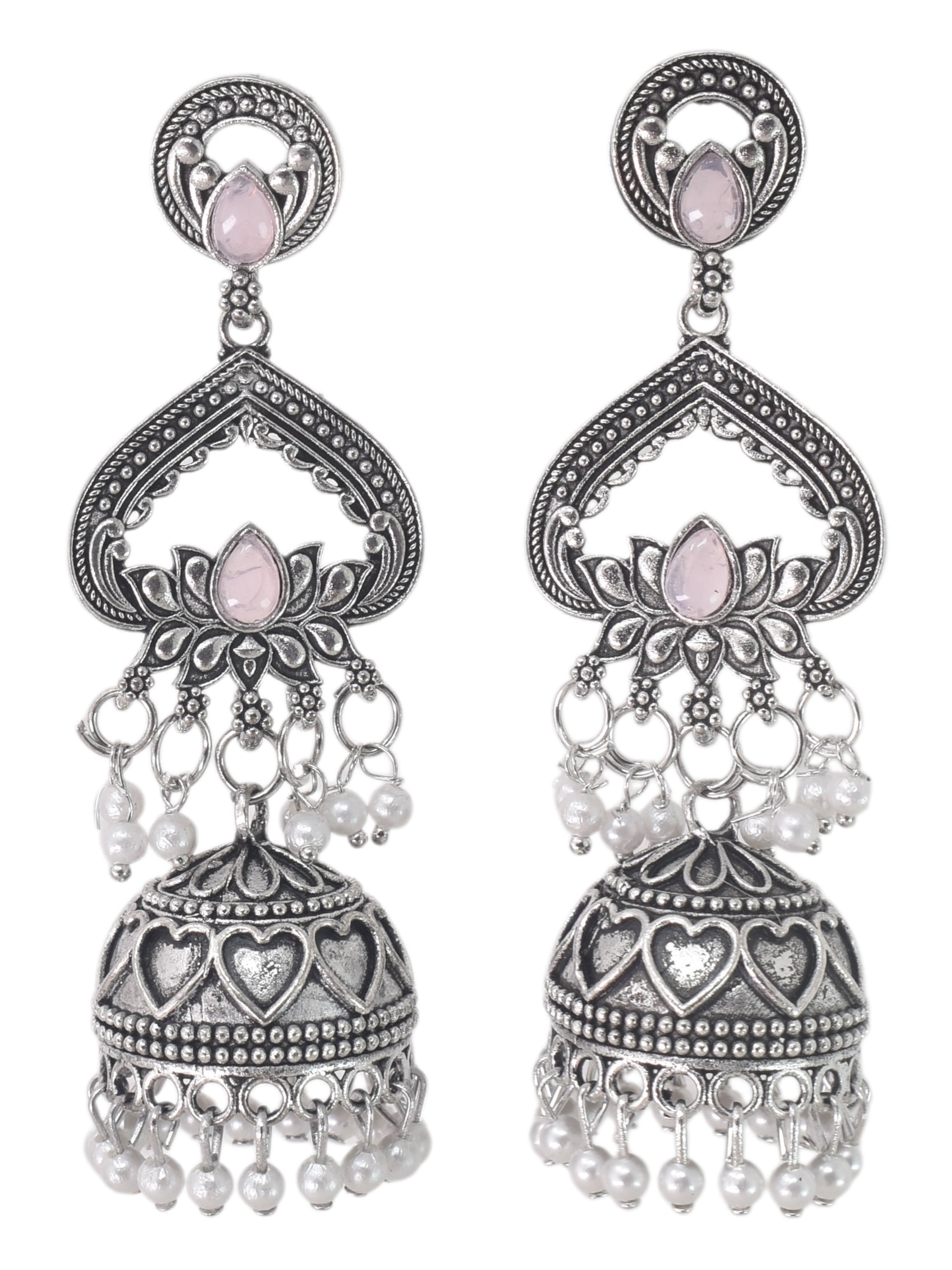 Silver Plated, Stylish Oxidised Lotus Motif Jhumka Earrings for Women & Girls, Traditional Ethnic Pearl Drop Wedding Festive Party Jewellery, Traditional Floral Design Lavender Colored Ethnic Earring