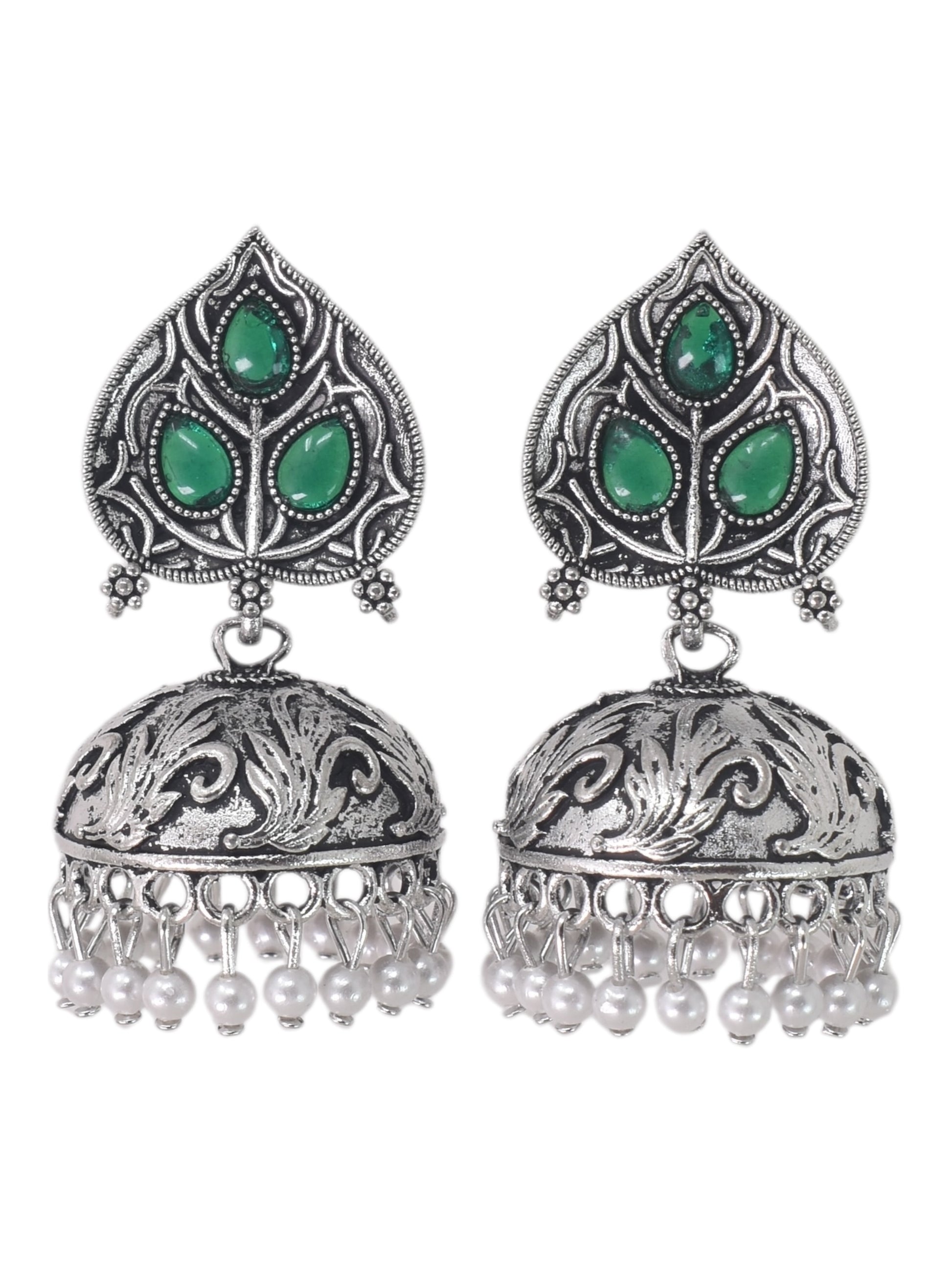 Silver Plated, Stylish Oxidised Paan Motif Jhumka Earrings for Women and Girls, Traditional Ethnic Pearl Drop Wedding Festive Party Jewellery, Traditional Leaf Design Green Coloured Ethnic Earring