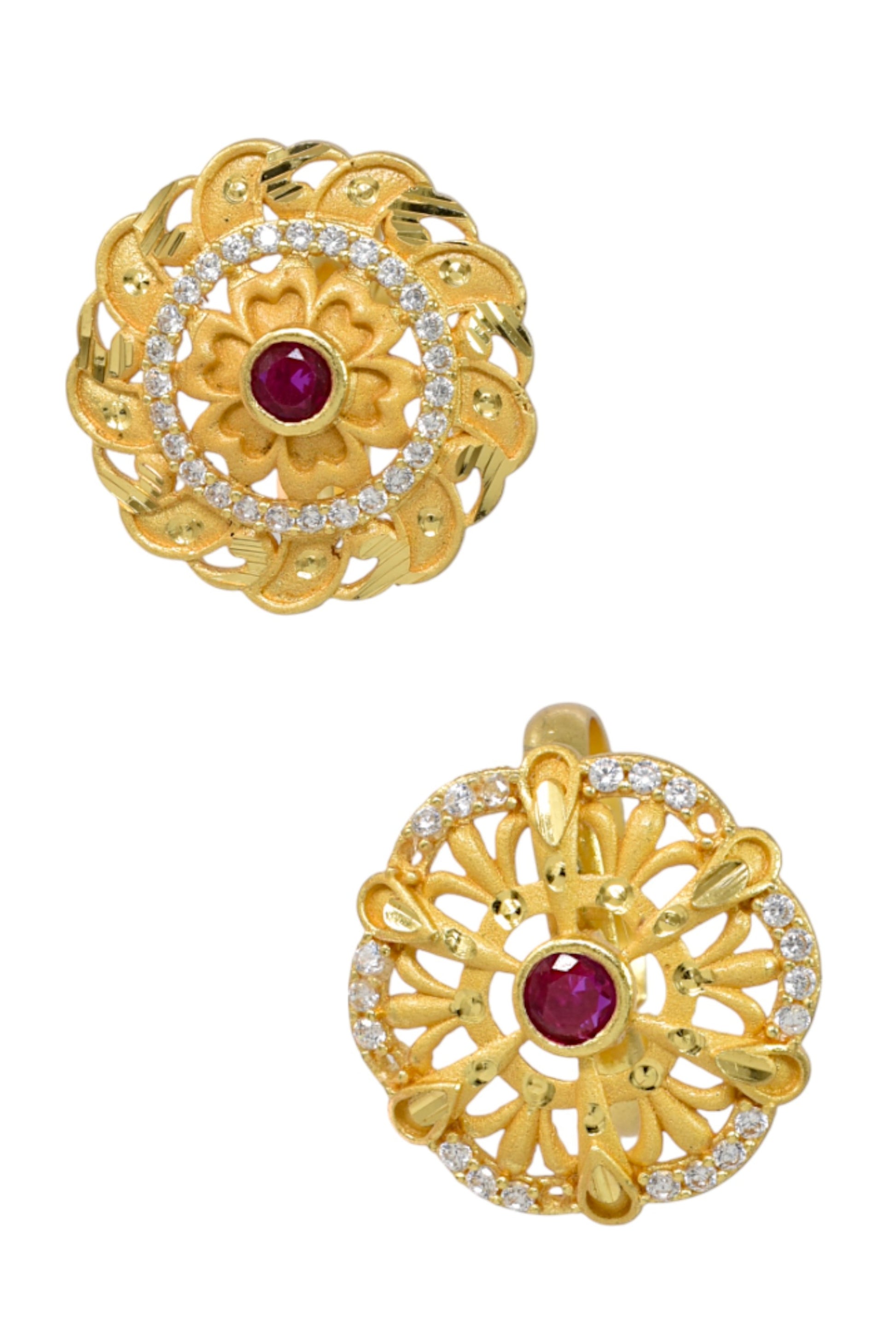 Make a bold and elegant statement with this Royal Floral Ruby AD Studded Ring from Rajkamal Jewellers. Designed with intricate floral craftsmanship, this premium gold plated adjustable ring features a striking ruby-colored center stone surrounded by sparkling American Diamonds (AD). The detailed petal design and textured gold finish give it a luxurious and traditional appeal, perfect for weddings, festive celebrations, and grand occasions. The adjustable band ensures a comfortable fit, making it a versatile addition to your jewelry collection or a thoughtful gifting option. ? Why You’ll Love It: Premium gold plated finish Elegant floral design Ruby center stone with AD halo setting Adjustable size for perfect fit Ideal for bridal, festive & party wear Statement piece with traditional charm Pair it with sarees, lehengas, or ethnic gowns to complete your royal look. ?? Product Details Type: Adjustable Statement Ring Stone: Ruby-colored center stone Accent Stones: American Diamonds (AD) Finish: Gold Plated Size: Adjustable (Free Size) Occasion: Wedding, Festive, Party Wear Brand: Rajkamal Jewellers