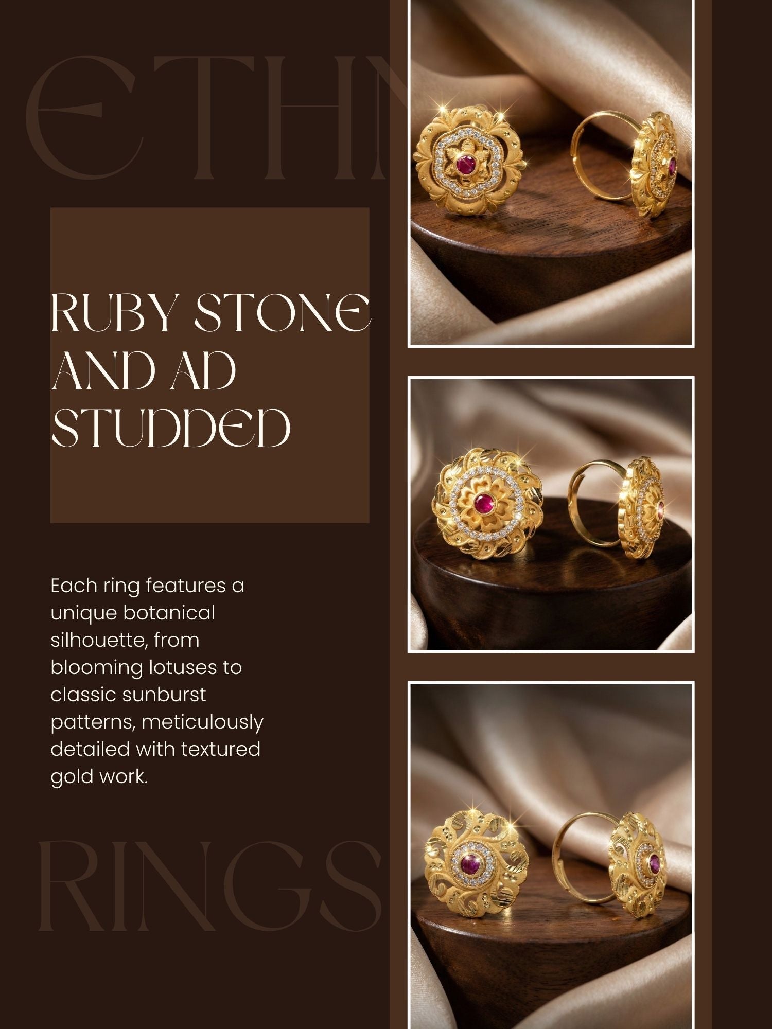Make a bold and elegant statement with this Royal Floral Ruby AD Studded Ring from Rajkamal Jewellers. Designed with intricate floral craftsmanship, this premium gold plated adjustable ring features a striking ruby-colored center stone surrounded by sparkling American Diamonds (AD). The detailed petal design and textured gold finish give it a luxurious and traditional appeal, perfect for weddings, festive celebrations, and grand occasions. The adjustable band ensures a comfortable fit, making it a versatile addition to your jewelry collection or a thoughtful gifting option. ? Why You’ll Love It: Premium gold plated finish Elegant floral design Ruby center stone with AD halo setting Adjustable size for perfect fit Ideal for bridal, festive & party wear Statement piece with traditional charm Pair it with sarees, lehengas, or ethnic gowns to complete your royal look. ?? Product Details Type: Adjustable Statement Ring Stone: Ruby-colored center stone Accent Stones: American Diamonds (AD) Finish: Gold Plated Size: Adjustable (Free Size) Occasion: Wedding, Festive, Party Wear Brand: Rajkamal Jewellers