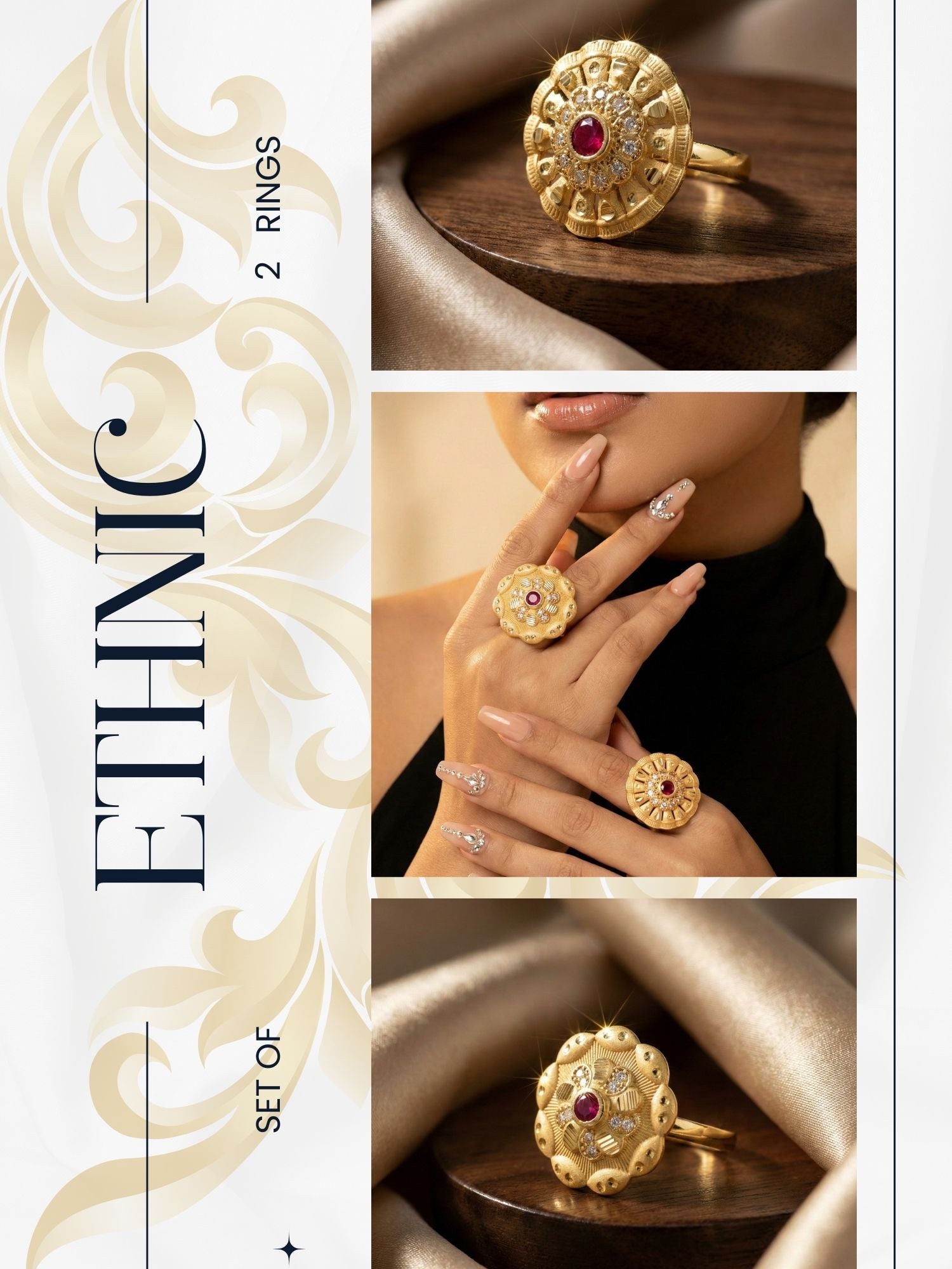 Combo set of 2-Designer Floral AD Ring with Ruby Center – Adjustable Fit