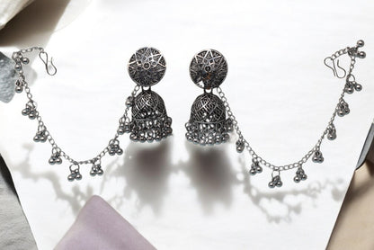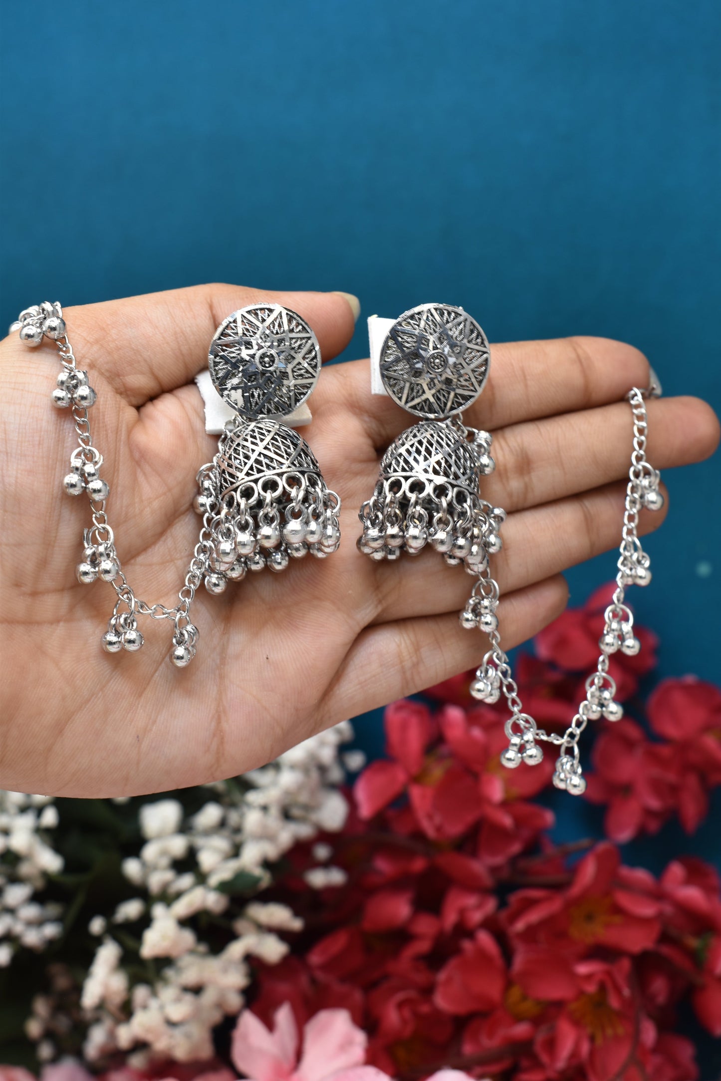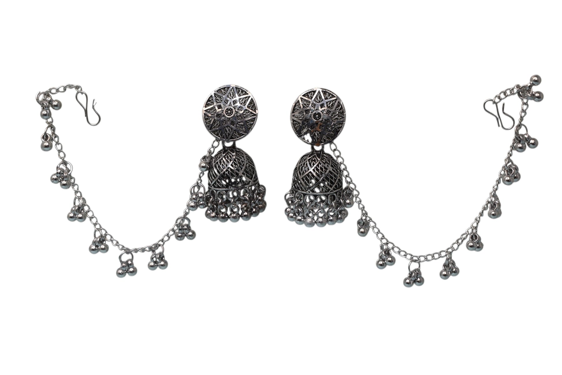 पारंपरिक नवीनतम डिजाइन ऑक्सीडाइज़्ड सिल्वर प्लेटेड झुमका इयररिंग, बाहुबली इयररिंग बाहुबली चेन।