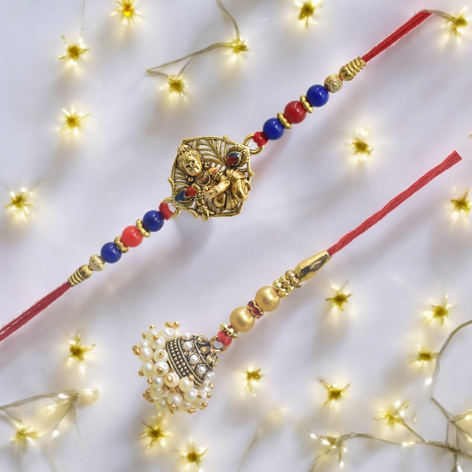 पारंपरिक कृष्णा डिज़ाइन भैया भाभी राखी सेट, रक्षाबंधन पर भाई के लिए 2 राखी का उत्तम सेट