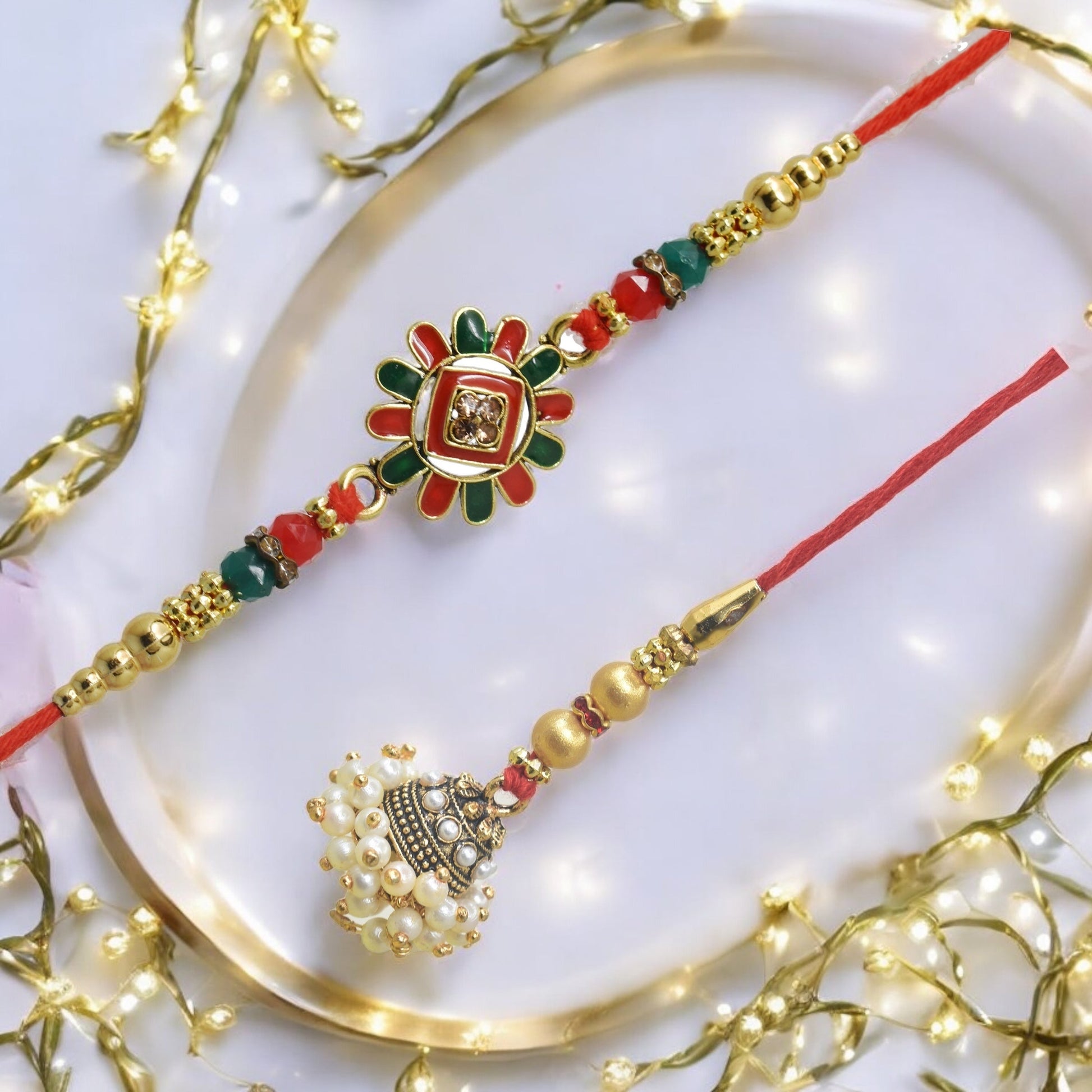 पारंपरिक फूल डिजाइन भैया भाभी राखी सेट, रक्षाबंधन पर भाई के लिए 2 राखी का उत्तम सेट