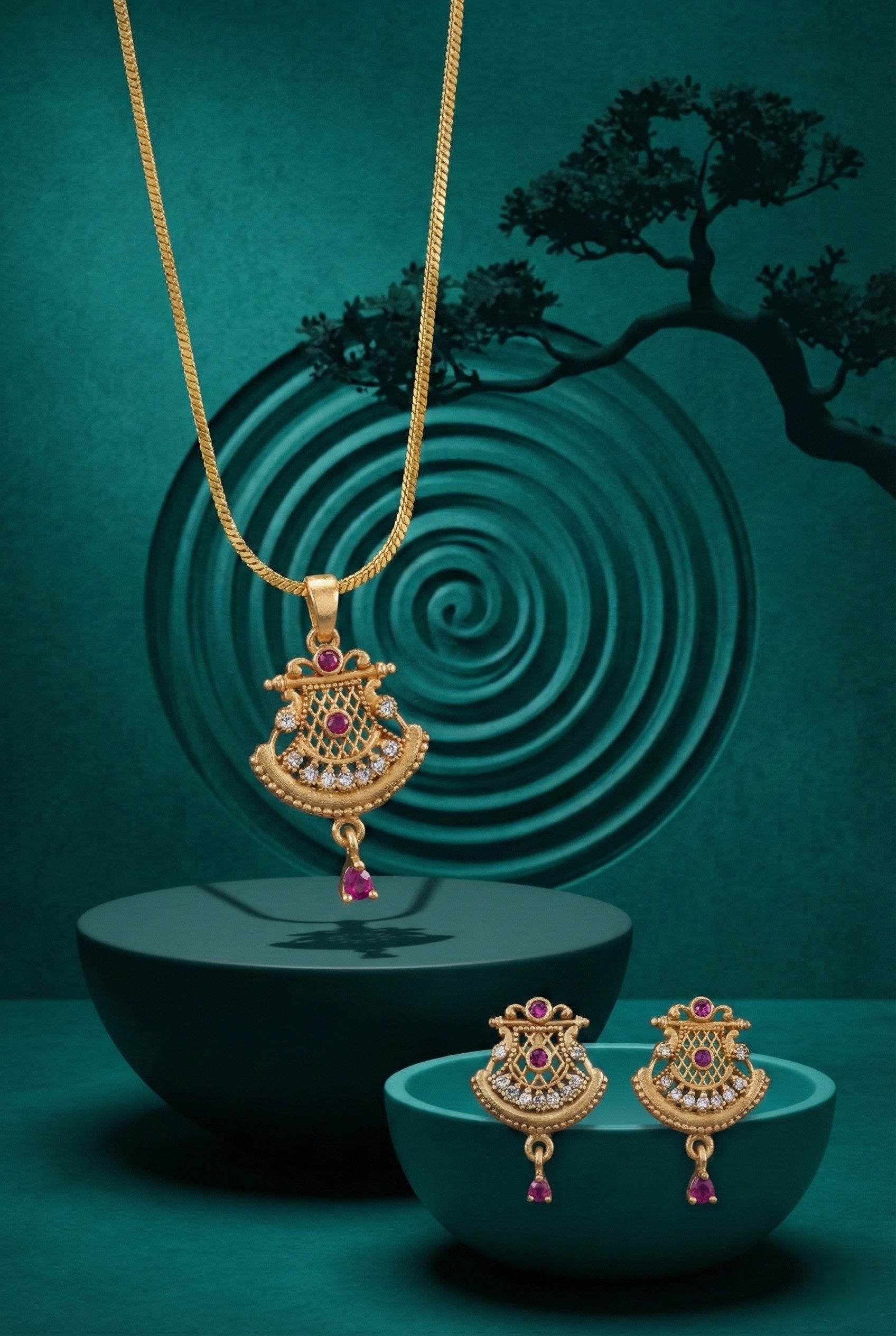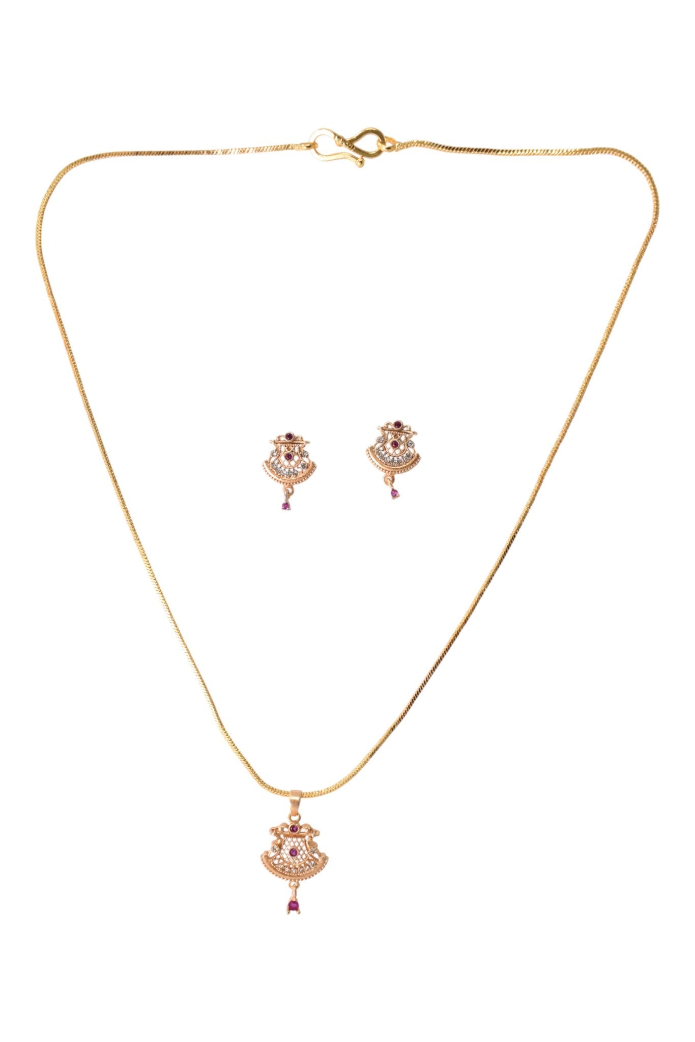 Elevate your jewellery collection with this beautifully crafted gold plated pendant necklace featuring shimmering stone detailing and a graceful pink center accent. The sleek, finely finished chain enhances the pendant’s contemporary appeal, while the sparkling stones catch the light with every movement, adding refined glamour to your look. Lightweight yet eye-catching, this necklace transitions effortlessly from daytime elegance to evening charm. Whether styled with sarees, kurtas, gowns or Indo-western outfits, it brings a polished finishing touch to festive gatherings, weddings, dinners and special occasions. A versatile accessory that blends modern aesthetics with timeless sophistication, perfect for everyday wear or thoughtful gifting.