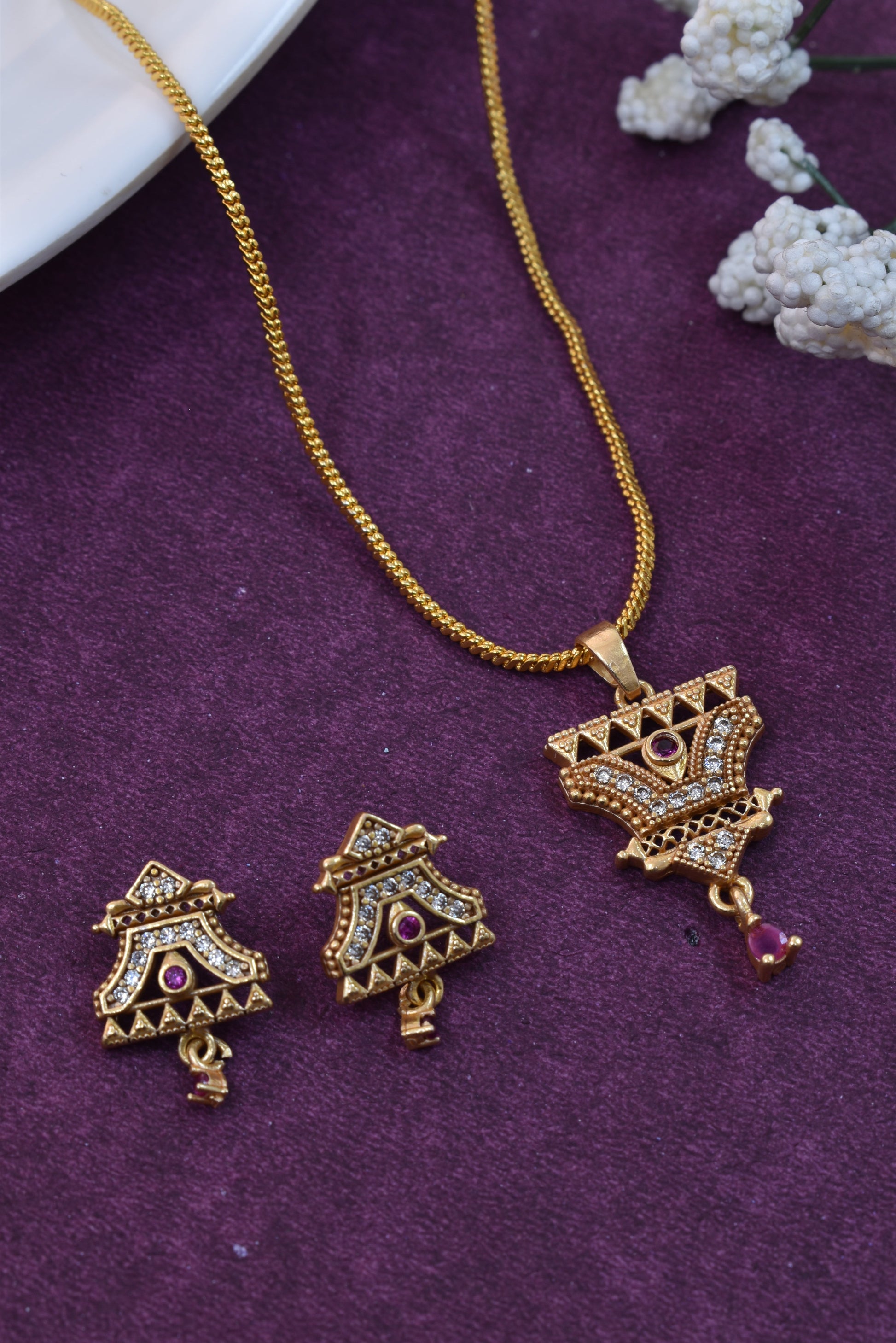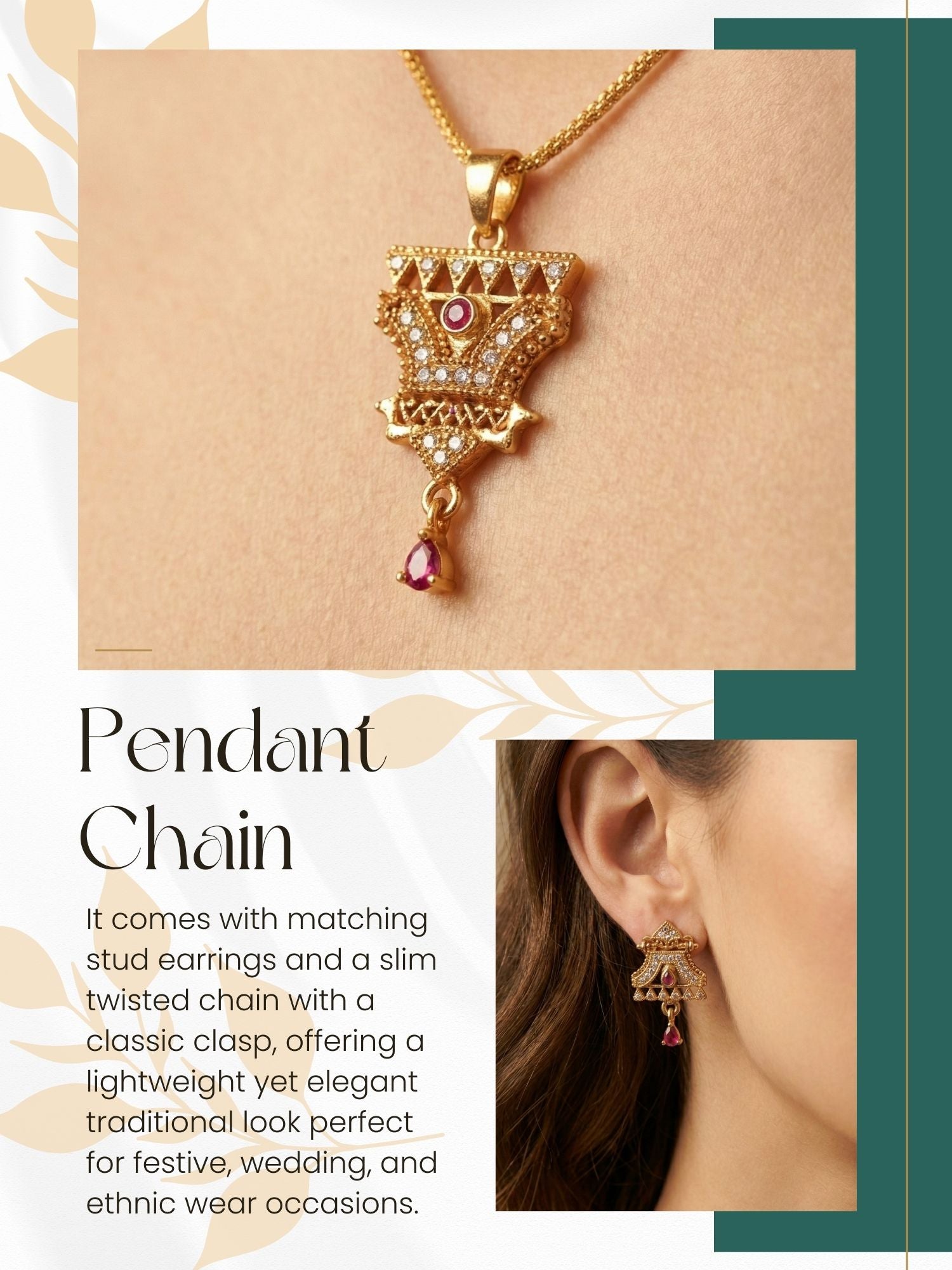 Elevate your jewellery collection with this beautifully crafted gold plated pendant necklace featuring shimmering stone detailing and a graceful pink center accent. The sleek, finely finished chain enhances the pendant’s contemporary appeal, while the sparkling stones catch the light with every movement, adding refined glamour to your look. Lightweight yet eye-catching, this necklace transitions effortlessly from daytime elegance to evening charm. Whether styled with sarees, kurtas, gowns or Indo-western outfits, it brings a polished finishing touch to festive gatherings, weddings, dinners and special occasions. A versatile accessory that blends modern aesthetics with timeless sophistication, perfect for everyday wear or thoughtful gifting.