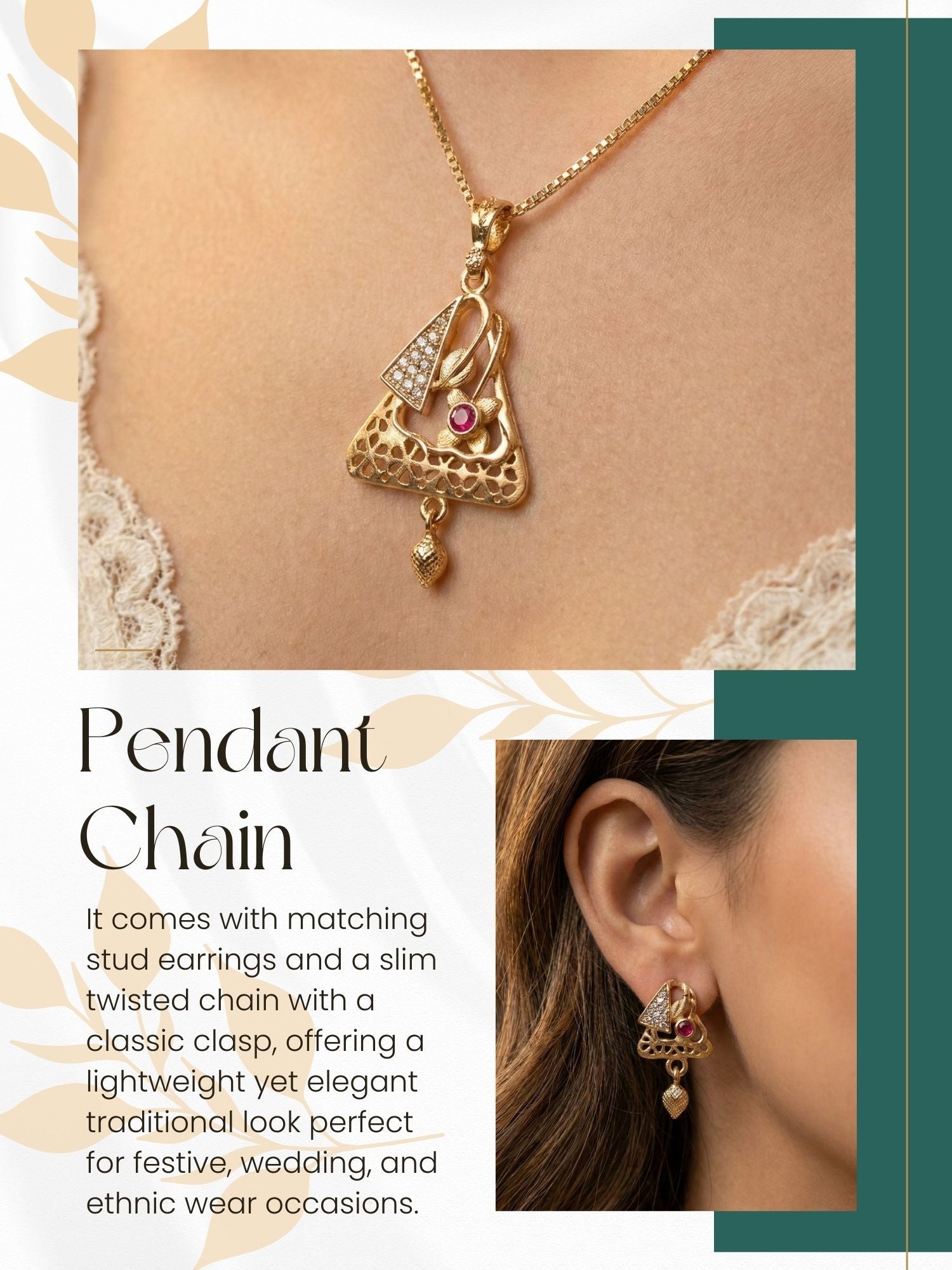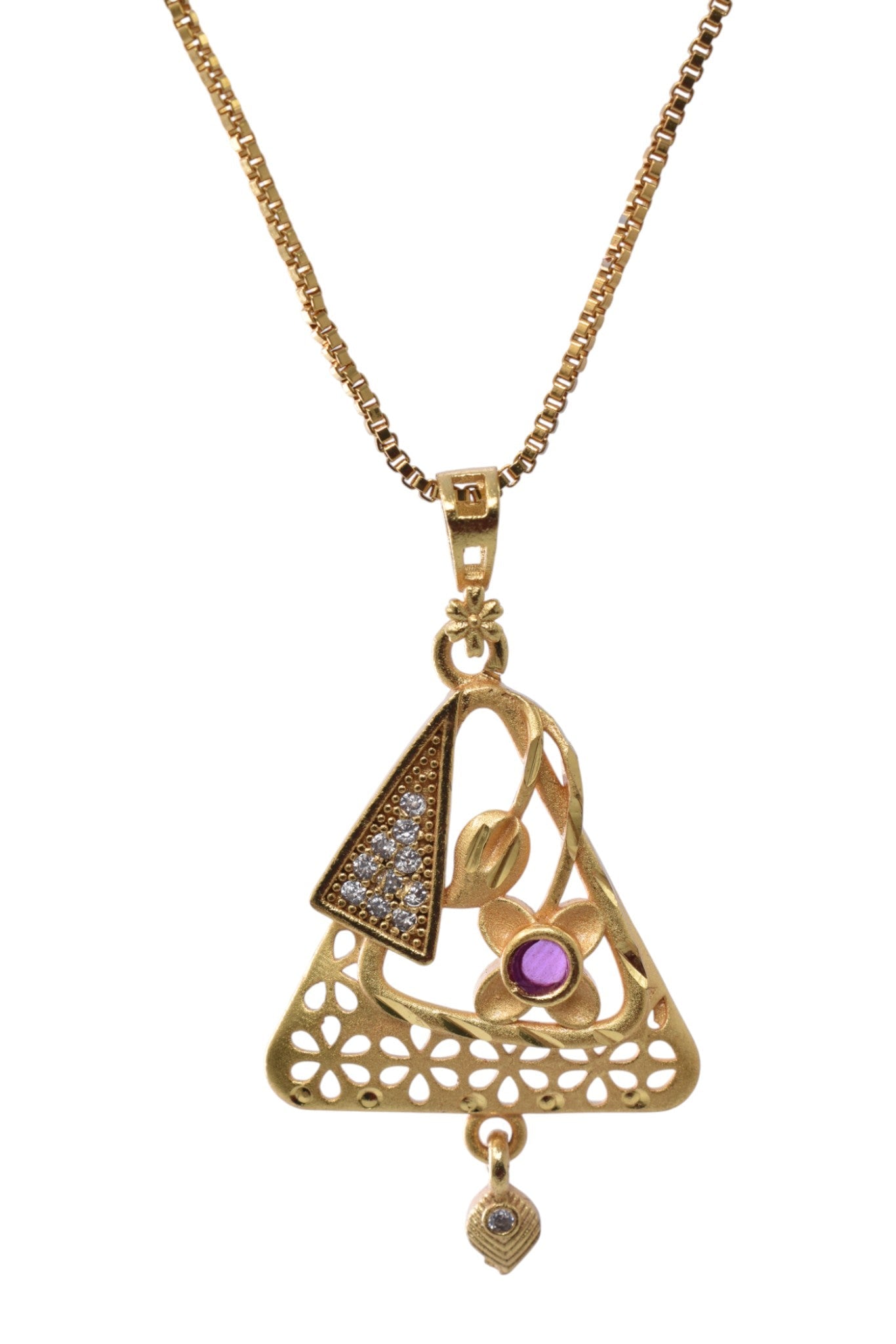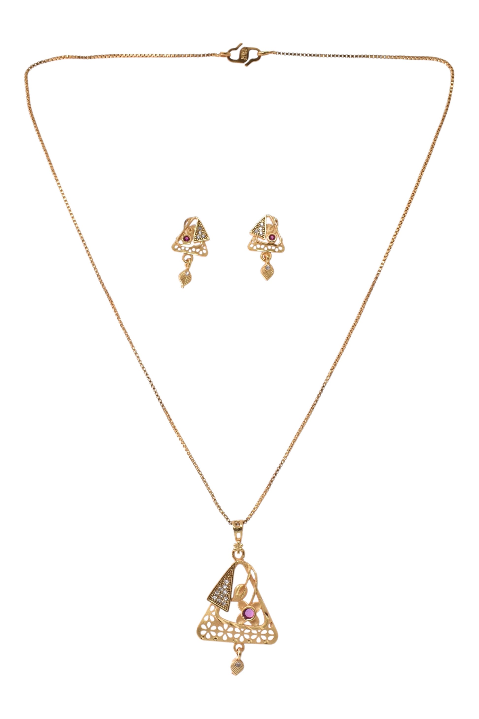 Elevate your jewellery collection with this beautifully crafted gold plated pendant necklace featuring shimmering stone detailing and a graceful pink center accent. The sleek, finely finished chain enhances the pendant’s contemporary appeal, while the sparkling stones catch the light with every movement, adding refined glamour to your look. Lightweight yet eye-catching, this necklace transitions effortlessly from daytime elegance to evening charm. Whether styled with sarees, kurtas, gowns or Indo-western outfits, it brings a polished finishing touch to festive gatherings, weddings, dinners and special occasions. A versatile accessory that blends modern aesthetics with timeless sophistication, perfect for everyday wear or thoughtful gifting.