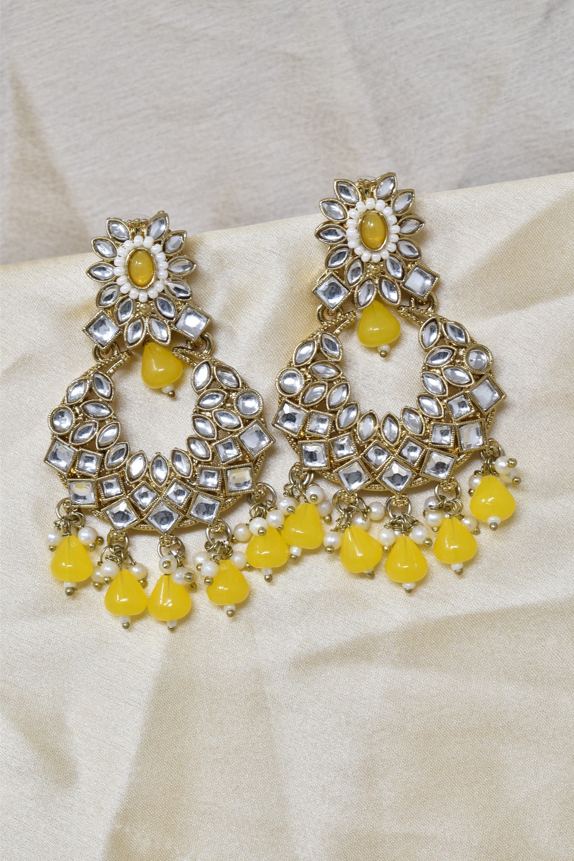 Elevate your ethnic jewellery collection with these premium Polki style chandbali jhumka earrings, designed to reflect timeless Indian elegance. Featuring finely set Polki stones, detailed craftsmanship, and graceful pearl drop embellishments, these earrings bring together traditional artistry and contemporary sophistication. The chandbali-inspired upper design flows beautifully into classic jhumka danglers, creating a striking statement look. Perfect for weddings, festive occasions, and special celebrations, these earrings pair effortlessly with sarees, lehengas, and ethnic ensembles. A must-have accessory for women who appreciate heritage-inspired luxury jewellery.