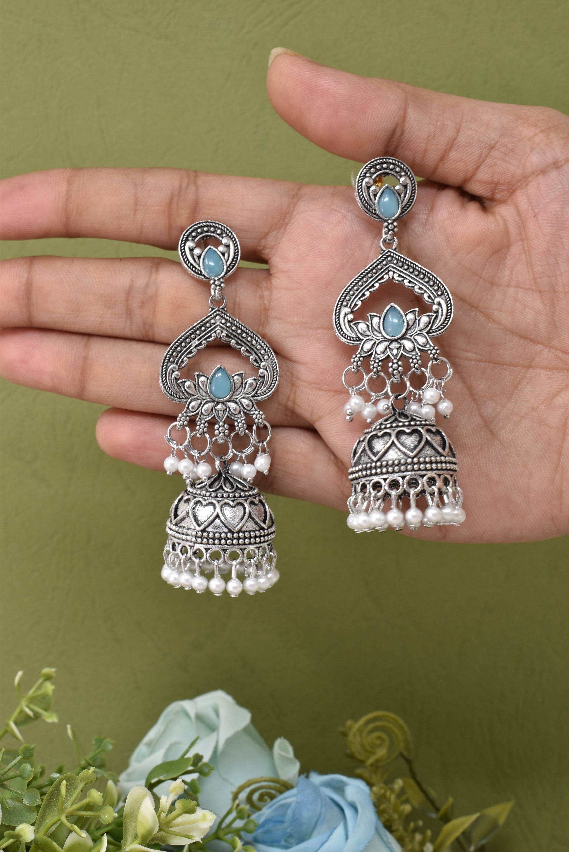 Silver Plated, Stylish Oxidised Lotus Motif Jhumka Earrings for Women & Girls, Traditional Ethnic Pearl Drop Wedding Festive Party Jewellery, Traditional Floral Design Sky Blue Colored Ethnic Earring